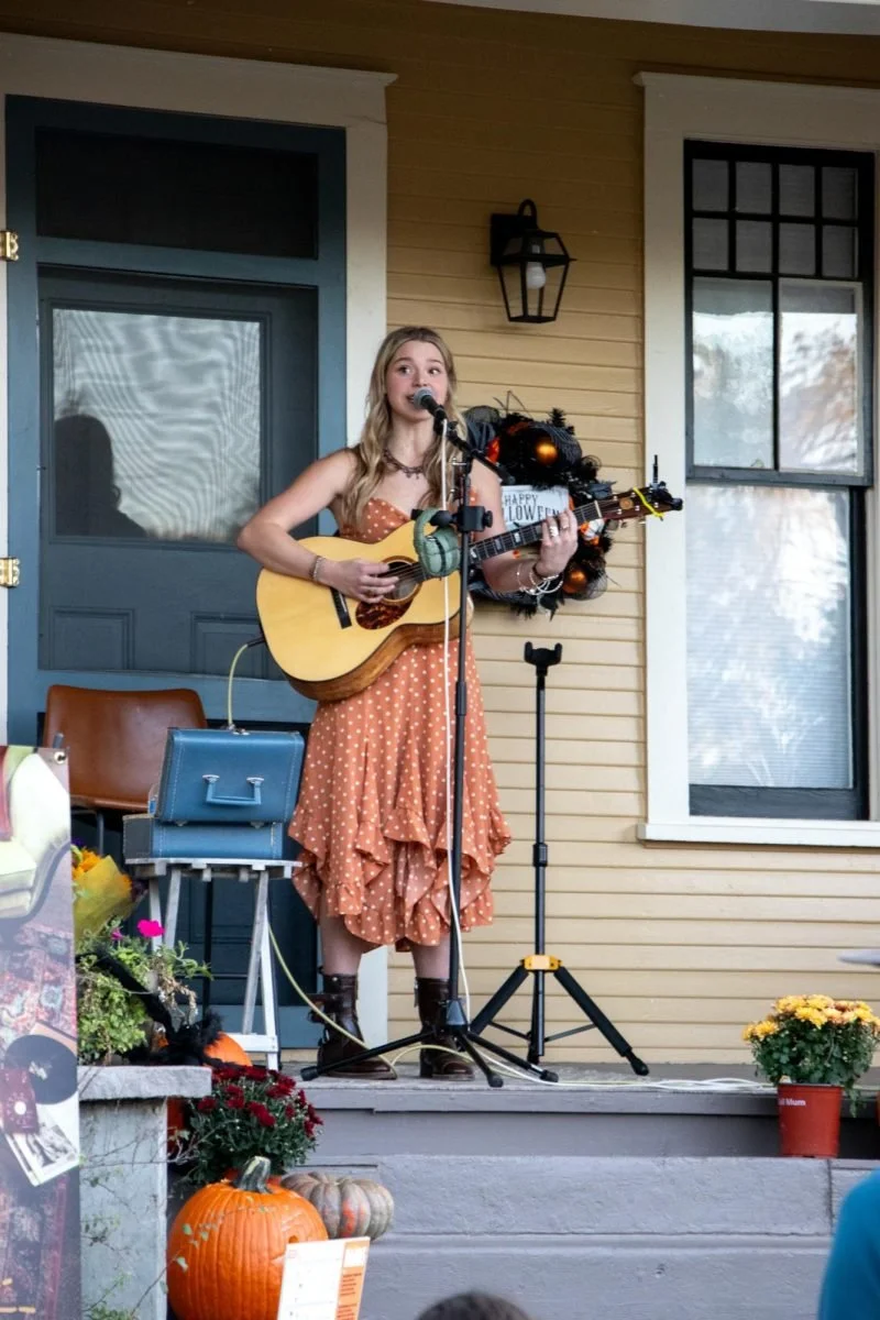 CMU alum Izzy Burns sings to an audience from the porch of a home in Grand Junction’s historic downtown neighborhood. Many other artists performed in the area as well.